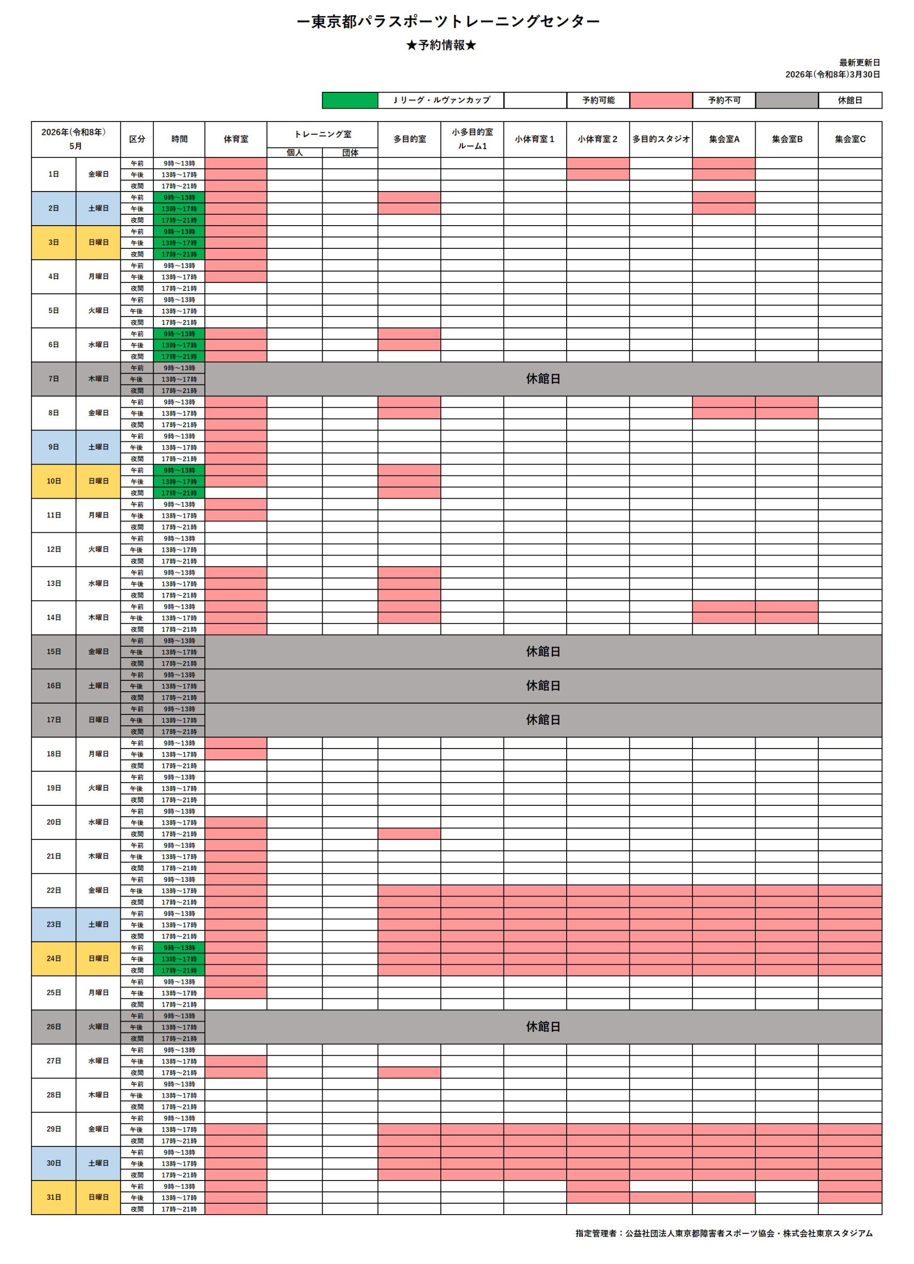 令和8年4月1日より予約可能な、令和8年5月の予約状況です。
